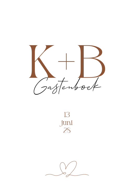 Een erg sierlijk houten gastenboek met een getekend hartje en grote, bruinkleurige initialen. Het boek heeft 2 ringen om zelf binnenwerk in te bundelen. Pas kleuren en typografie naar wens aan in de online editor.