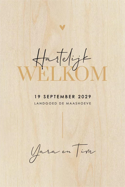 Verwelkom jullie gasten met een persoonlijk bruiloftsbord met hierop letters in goudkleur en klein hartje boven de tekst