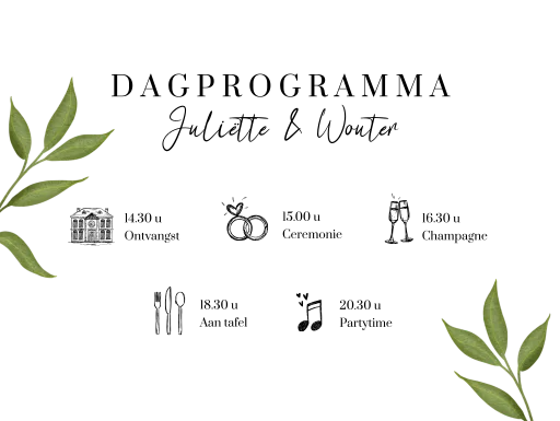 Verwelkom jullie gasten met een persoonlijk bruiloftsbord met hierop het programma van jullie grote dag! Dit programmabord met citroentakjes is perfect voor een zonnige bruiloft.
