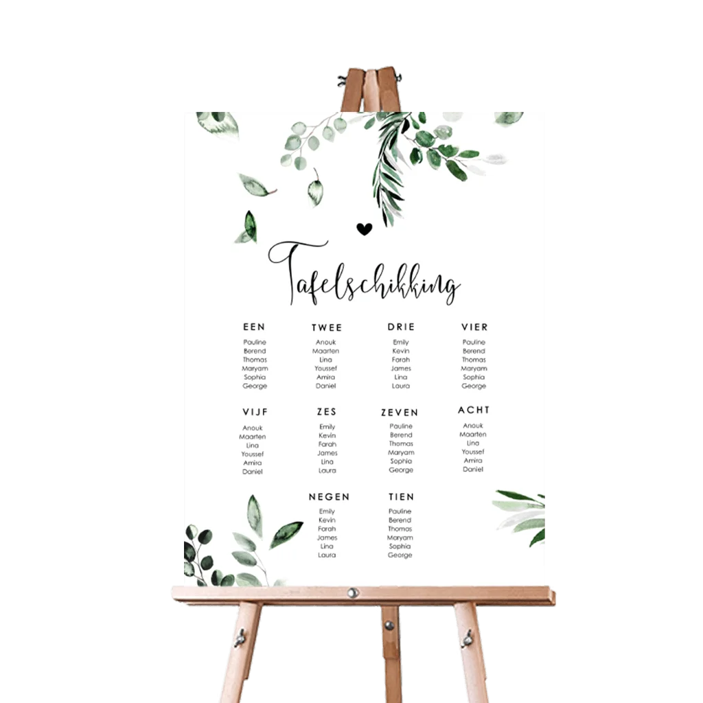 Maak in onze editor eenvoudig zelf een bord met tafelschikking voor jullie bruiloft, in dezelfde stijl als jullie trouwkaart.