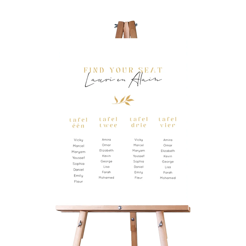 Maak eenvoudig zelf een bord met de tafelschikking voor jullie bruiloft in dezelfde stijl als jullie trouwkaart! Hoe mooi is bijvoorbeeld dit wit met gouden bord?
