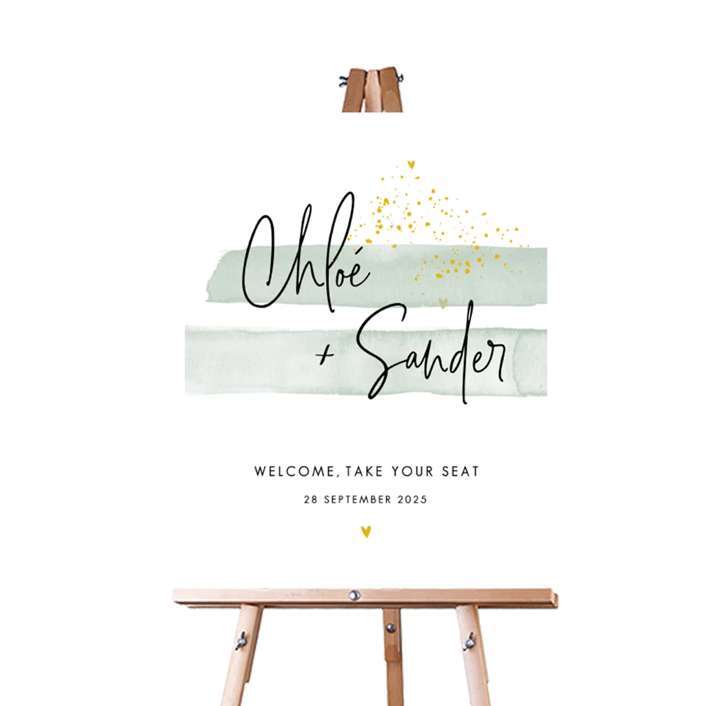 Verwelkom jullie gasten met een persoonlijk welkomstbord. Pas gemakkelijk het design zelf aan en ga aan de slag met onze editor.