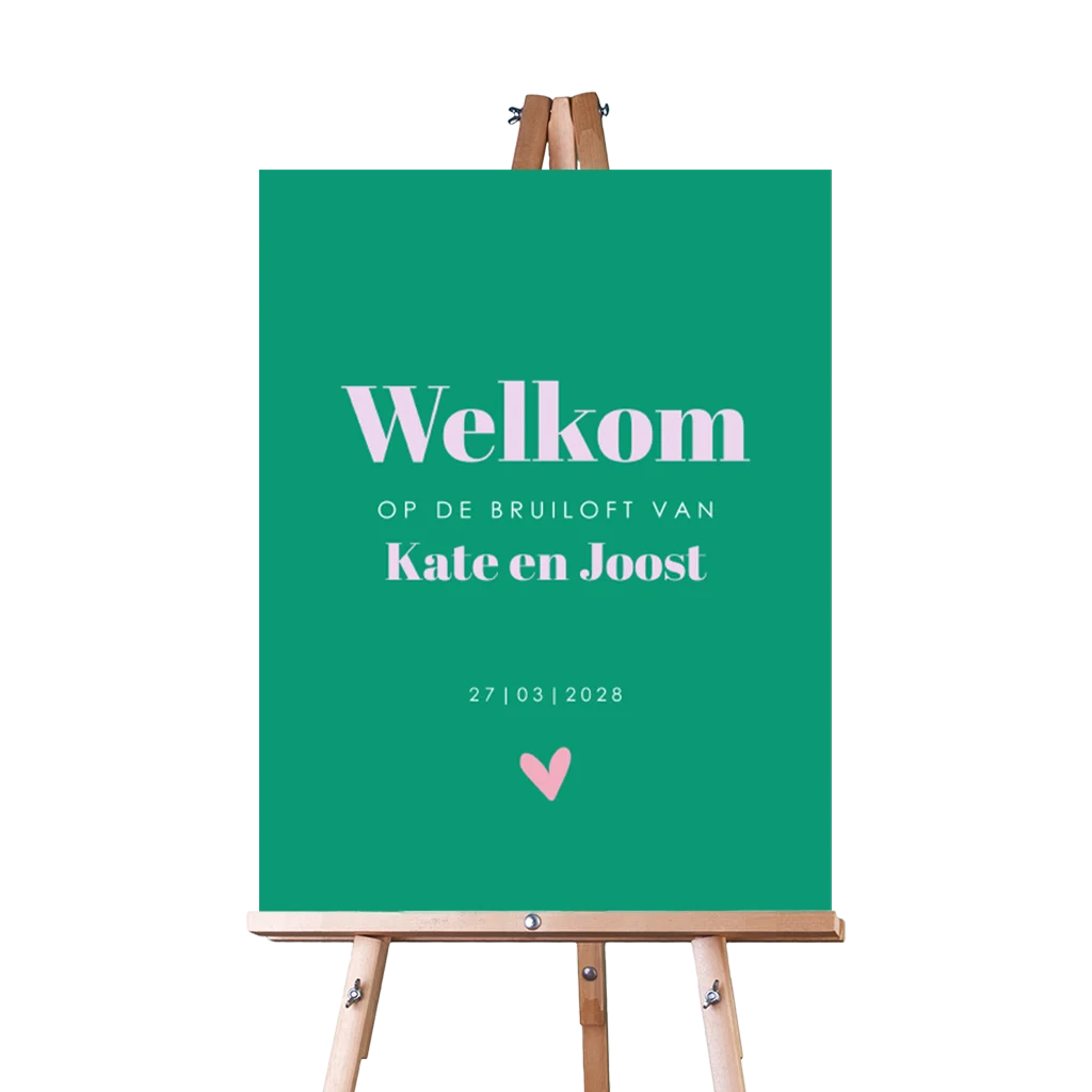 Verwelkom de gasten op jullie bruiloft met dit prachtige welkomstbord met colorblocking design in groen en roze! Pas kleuren, lettertypes en andere elementen gemakkelijk aan met de editor.