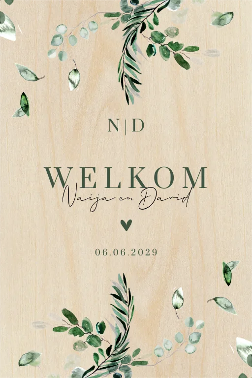 Welkomstbord van hout voor bruiloft met eucalyptus takjes