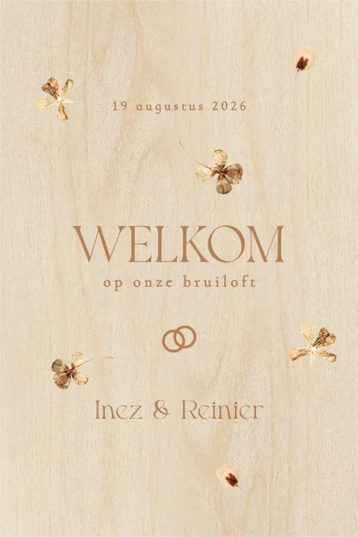 Welkomstbord van hout voor bruiloft met gele droogbloemen