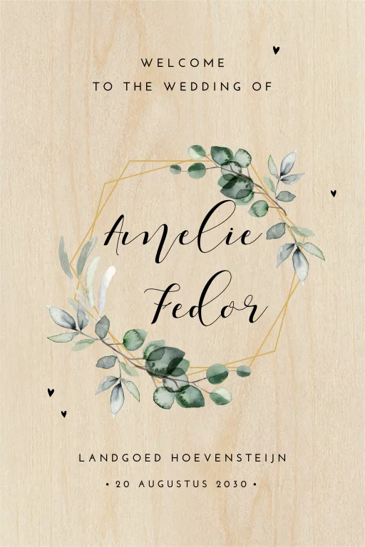 Verwelkom de gasten op jullie bruiloft met dit houten welkomstbord in dezelfde stijl als jullie trouwkaart! Pas het ontwerp naar wens aan in de online editor.