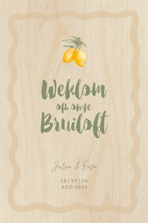 Zei iemand daar Italiaanse bruiloft? Dit vrolijke welkomstbord met citroenen brengt jullie helemaal in Mediterraanse sferen! Pas kleuren en typografie naar wens aan in de editor.