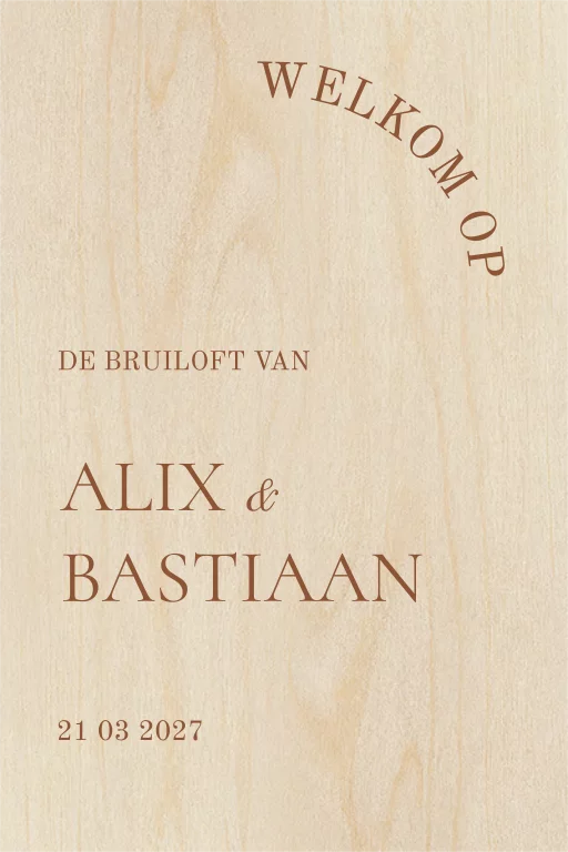 Welkomstbord van hout voor bruiloft met opdruk in aardetinten