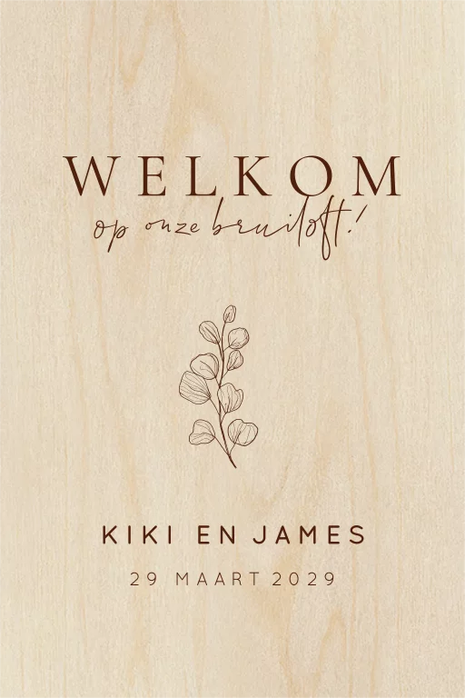 Welkomstbord van hout voor bruiloft met bloem in neutrale kleuren