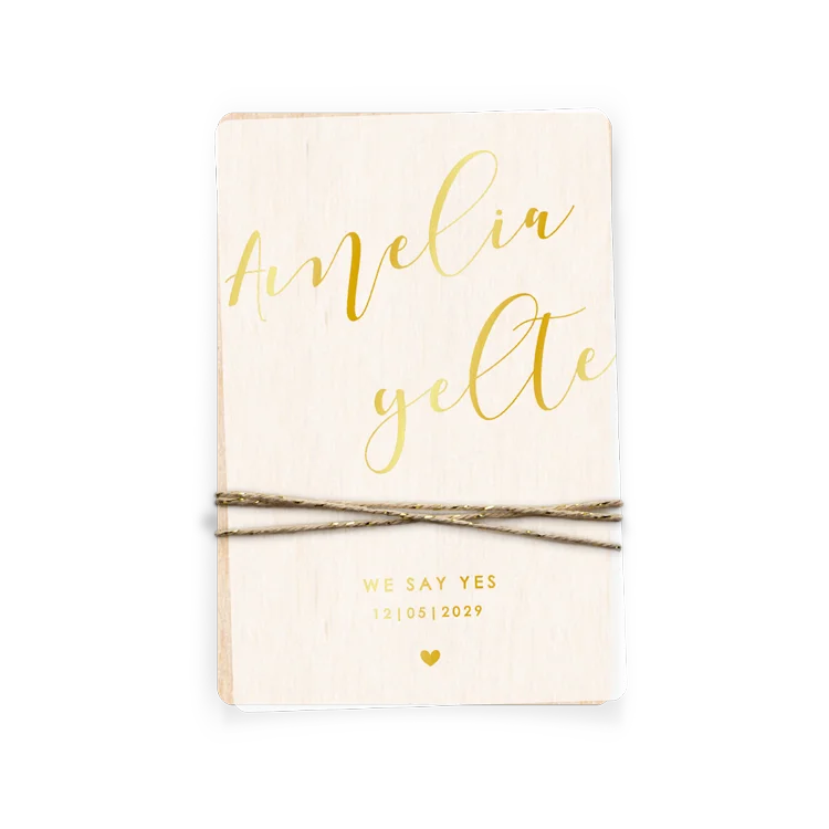 Deze premium trouwkaart met calco voorblad bestaand uit twee lagen. Je hebt de keuze in samenstelling van materialen, bevestigingsmateriaal, rechte of ronde hoeken en foliekleur. Zo maak je de kaart helemaal naar jullie smaak.