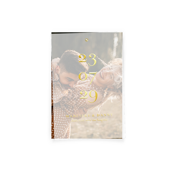 Trouwkaart kalkpapier met foto en datum in goudfolie