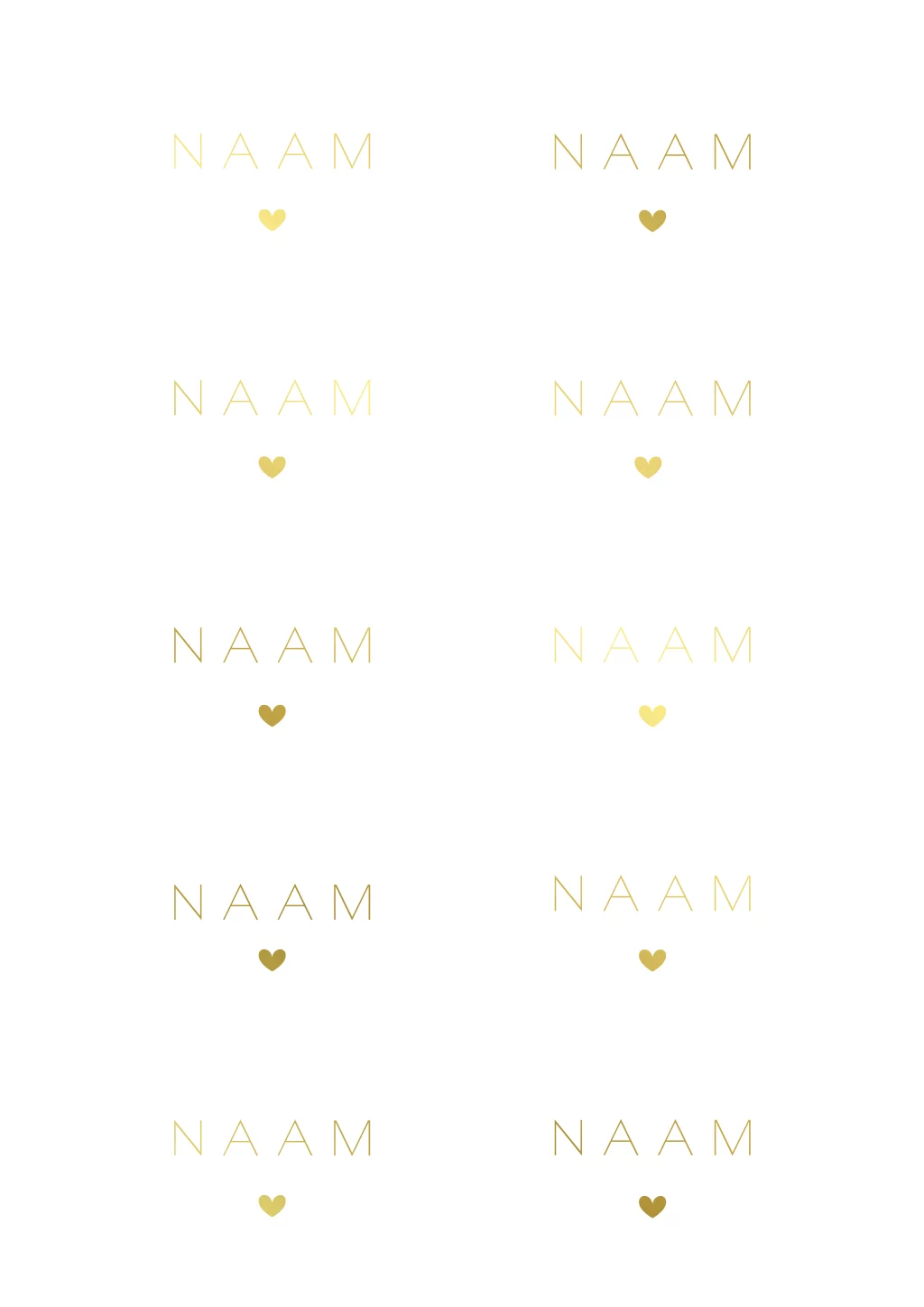 Stijlvolle naamkaartjes om zelf te maken met de naam van jullie gasten en een romantisch hartje in goudfolie. Maak jullie bruiloft compleet en bestel naamkaartjes in de stijl van jullie trouwkaart. Pas gemakkelijk het design zelf aan en ga aan de slag met onze editor.
