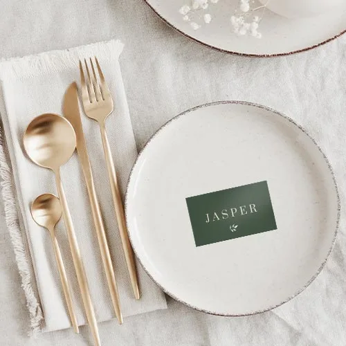Stijlvolle botanische naamkaartjes in donkergroen met een eucalyptus takje onder de naam. Maak jullie bruiloft compleet en bestel naamkaartjes in de stijl van jullie trouwkaart. Pas gemakkelijk het design zelf aan en ga aan de slag met onze editor.