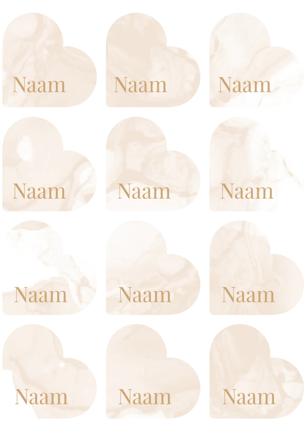Maak jullie bruiloft compleet en bestel naamkaartjes in de stijl van jullie trouwkaart. Deze kaartjes hebben een hartjesvorm en hebben een lichtroze marmerlook achtergrond. Pas de namen gemakkelijk zelf aan in de editor.