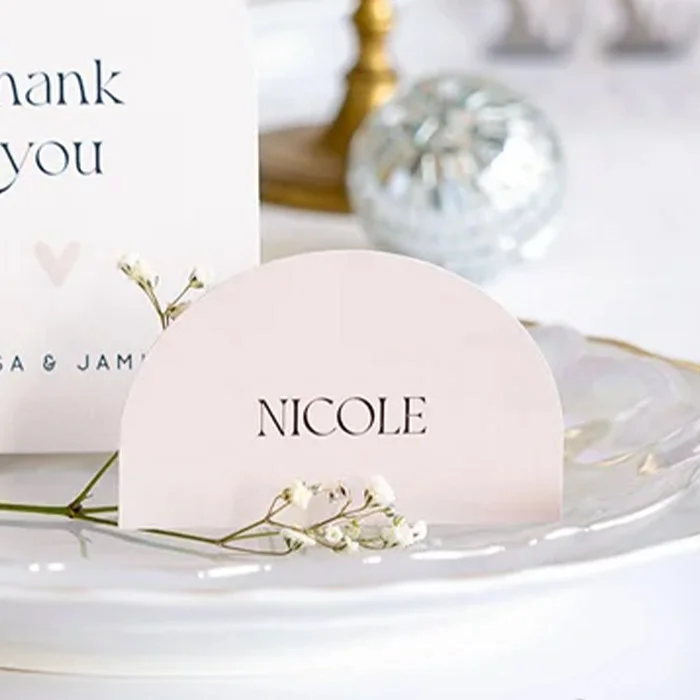 Hoe mooi zijn deze naamkaartjes in neutrale kleur met originele vorm? Maak jullie bruiloft compleet en bestel naamkaartjes in de stijl van jullie trouwkaart. Pas het design gemakkelijk zelf aan in de editor.