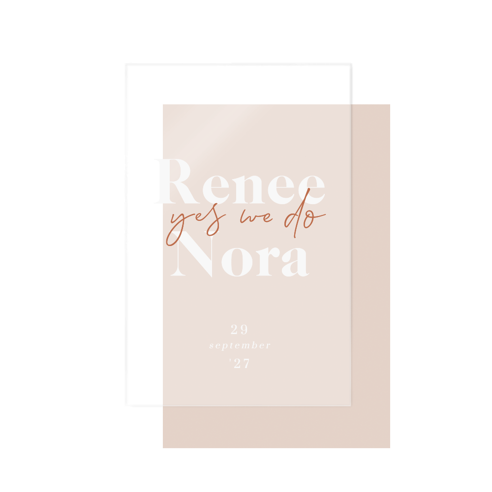 Op zoek naar een bijzondere kaart om jullie gasten uit te nodigen voor de grote dag? Deze chique trouwkaart bestaat uit twee delen. Het voorblad wordt gedrukt op helder transparant acryl, ook wel plexiglas genoemd, van 2 mm dik. Het achterblad wordt gedrukt op 170 grams papier. Beide kaarten bewerk je samen in de editor: handig!