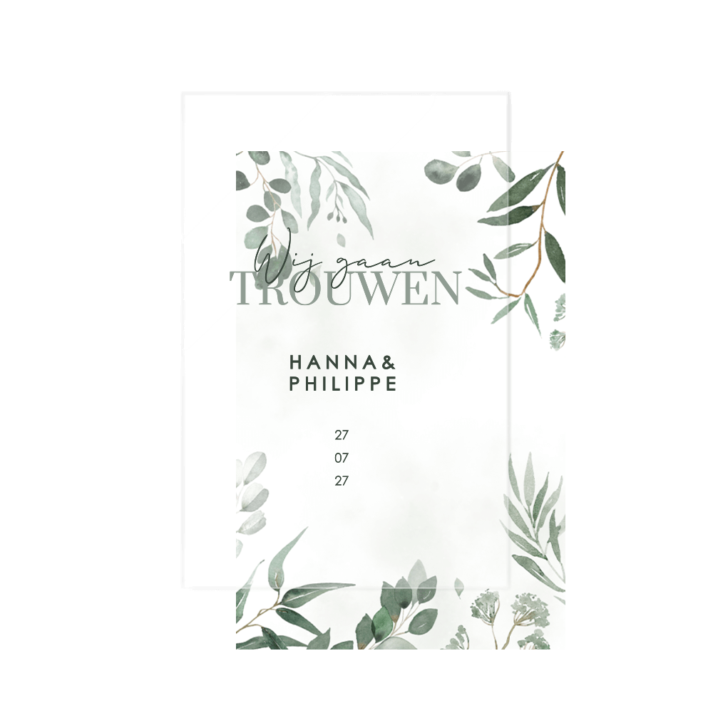 Bij een bijzondere dag, hoort een bijzondere kaart! Deze trouwkaart bestaat uit twee delen. Het voorblad wordt gedrukt op helder transparant acryl, ook wel plexiglas genoemd, van 2 mm dik. Het achterblad wordt gedrukt op 170 grams papier. Beide kaarten bewerk je samen in de editor: handig!