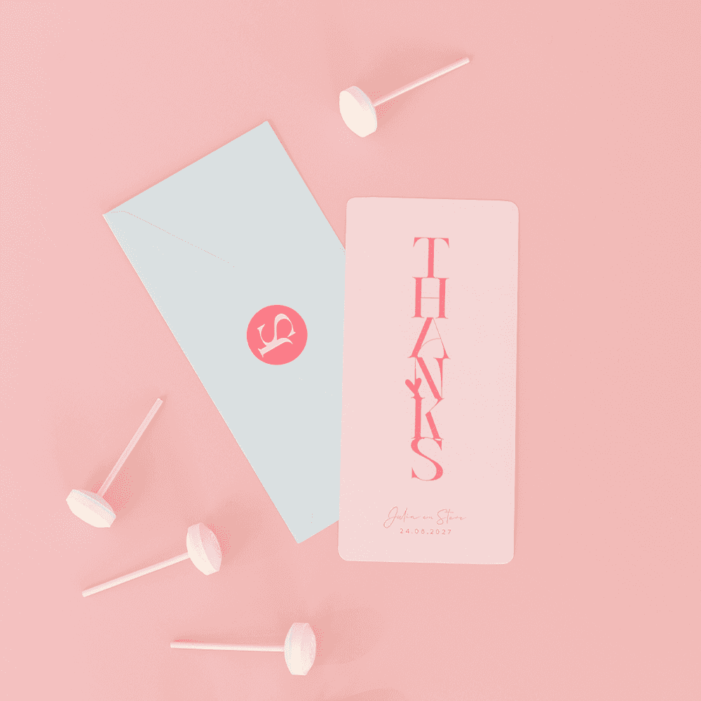 Bedankt jullie gasten met dit vrolijke roze/oranje color blocking bedankkaartje! Voeg een mooie bruidsfoto toe op de achterkant om het extra persoonlijk te maken.