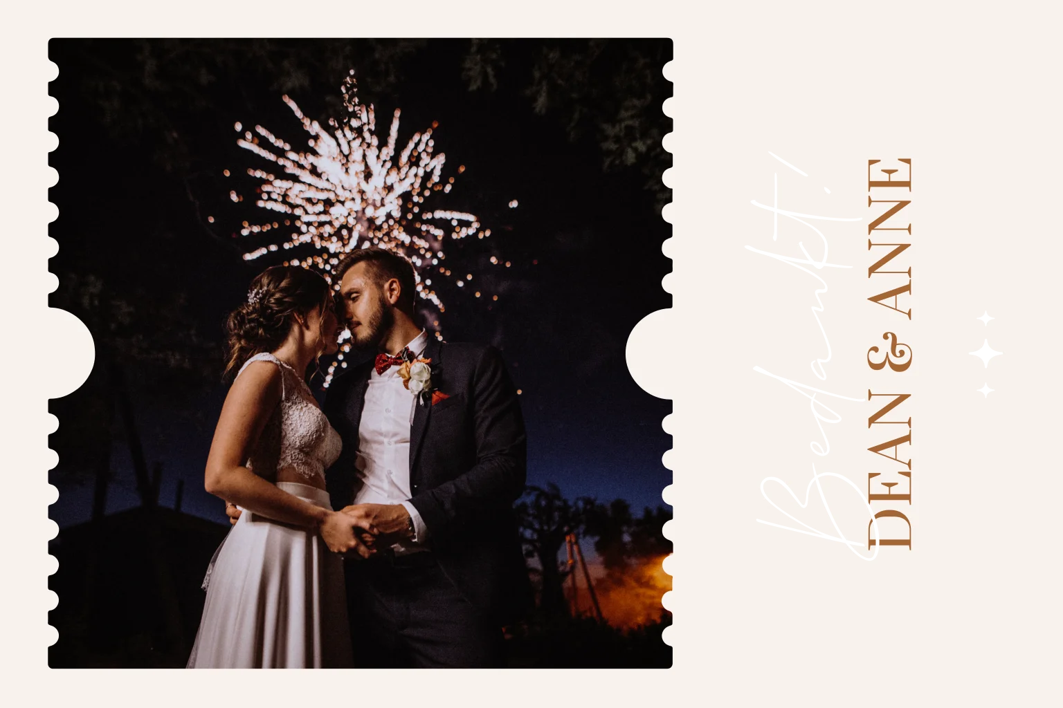 Bedank jullie gasten voor hun aanwezigheid met deze originele bedankkaart in de vorm van een festival ticket! Kies een mooie foto van jullie bruiloft en maak de kaart zo helemaal eigen.