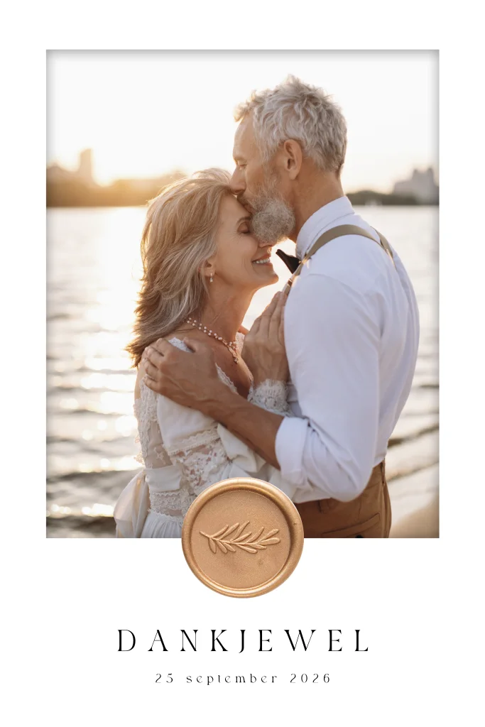 Een stijlvolle bedankkaart met ruimte voor jullie lievelingsfoto van de bruiloft. Maak de bedankkaart persoonlijk door de kleuren, teksten en lettertypes naar eigen smaak aan te passen.