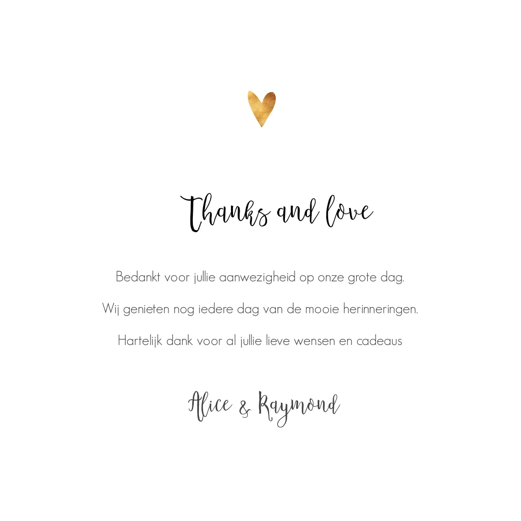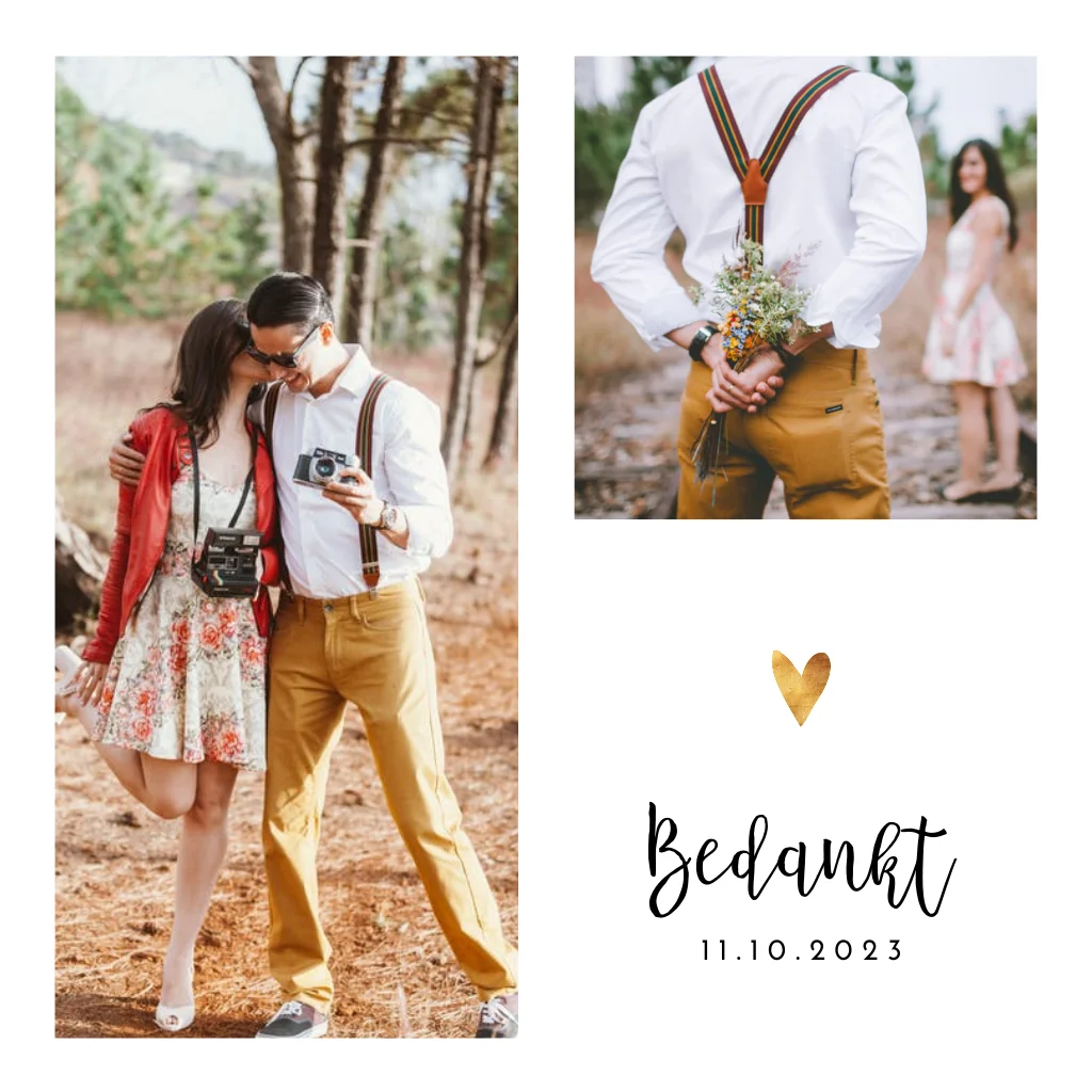 Persoonlijke bedankkaart met foto's en gouden hart. Tip van designer Marleen: Verstuur deze bedankkaarten in een gouden envelop, welke is dichtgeplakt met een mooie sluitzegel.