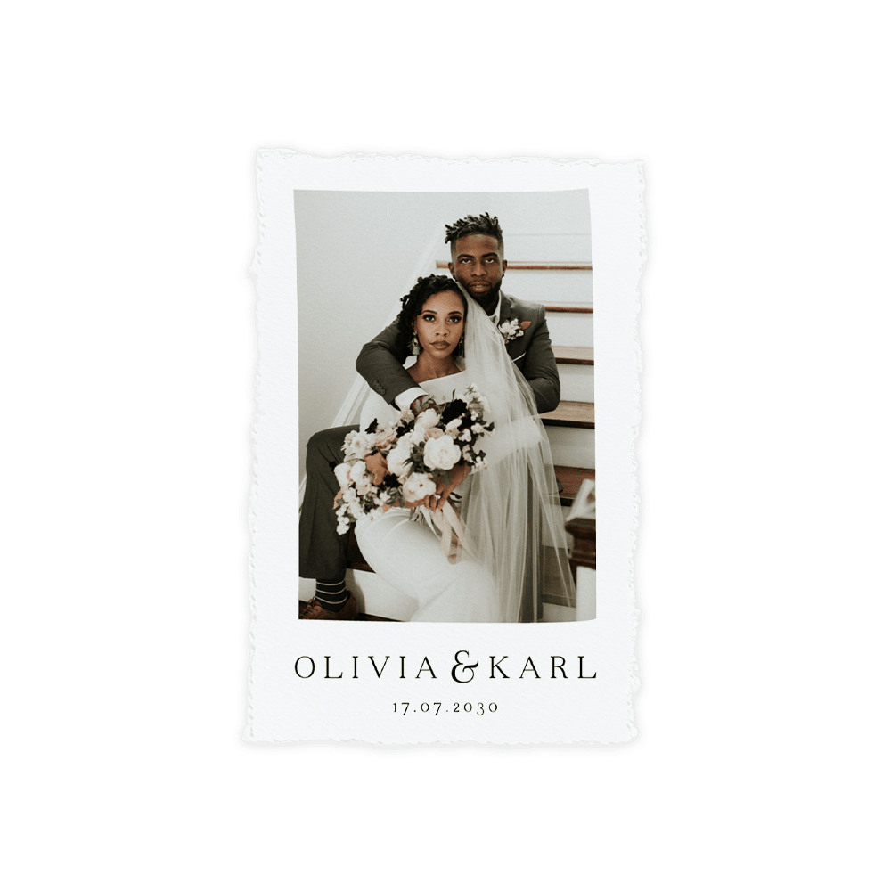Op zoek naar een originele bedankkaart voor jullie huwelijk? Ga voor deze trouwkaart met handgeschept papier-look met foto en klassieke typografie! De randen van het papier geven de kaart een authentiek en uniek uiterlijk. Je kunt het papier door middel van een speciale liniaal zelf scheuren om de handgeschepte look te bereiken. We raden je aan om onderstaande tips goed door te lezen voor het beste resultaat.