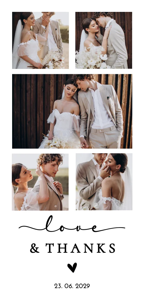 Bedank je bruiloftsgasten met deze stijlvolle bedankkaart met een fotocollage en een hartje. Bewerk het ontwerp eenvoudig in de editor.