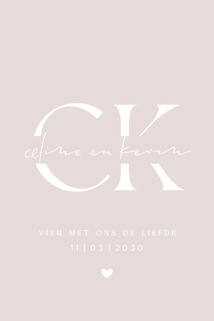 Trouwkaart in beige met initialen. Dit ontwerp is perfect voor stellen die op zoek zijn naar een eenvoudige en stijlvolle uitnodiging.