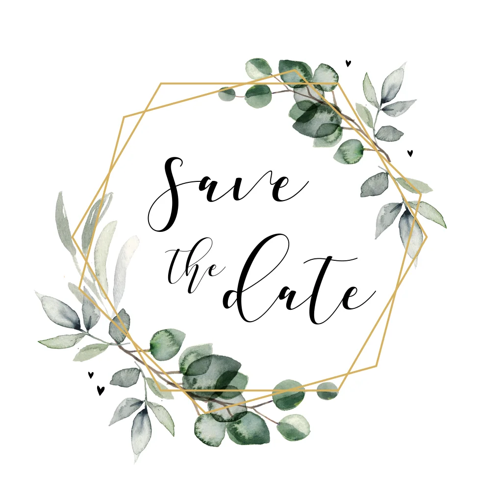 Save the date uitnodiging met geometrische vorm en eucalyptus takjes om jullie familie en vrienden uit te nodigen voor jullie grote dag.
