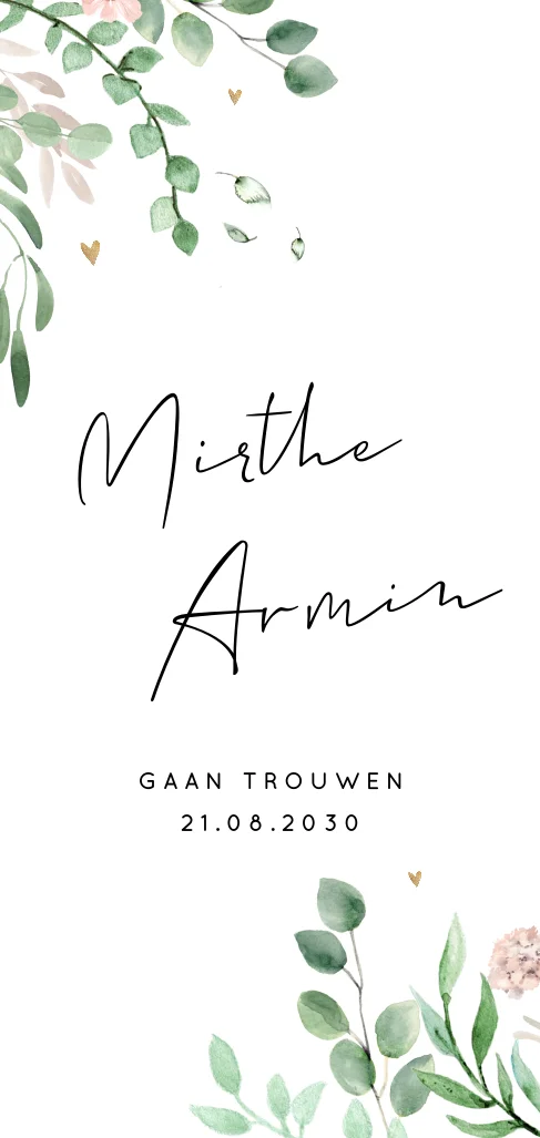 Botanisch trouwkaart met mooie illustraties van diverse blaadjes, planten en takjes. De goudkleurige hartjes maken deze kaart helemaal af.