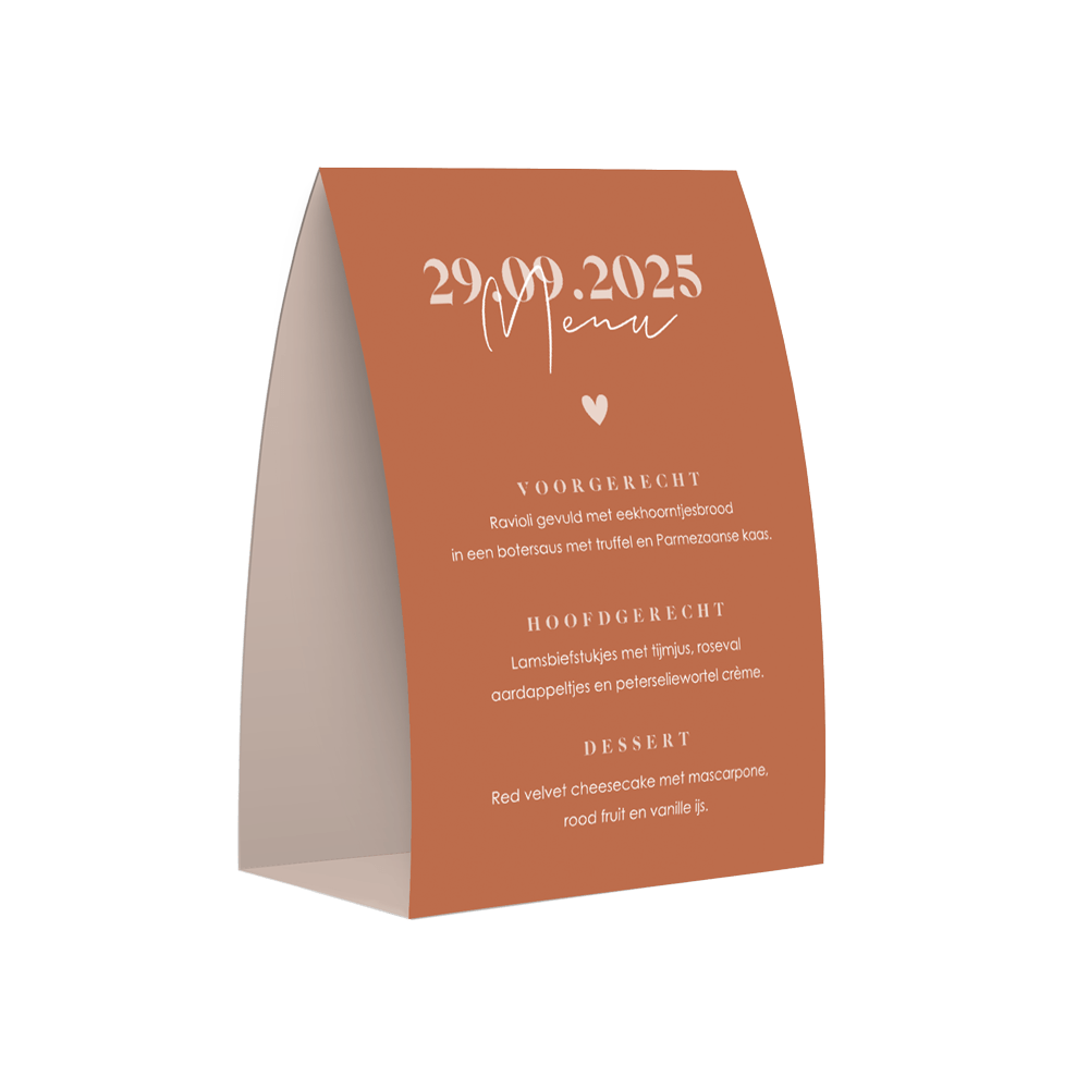 Stijlvolle menukaart in tentvorm met de terracotta trendkleur