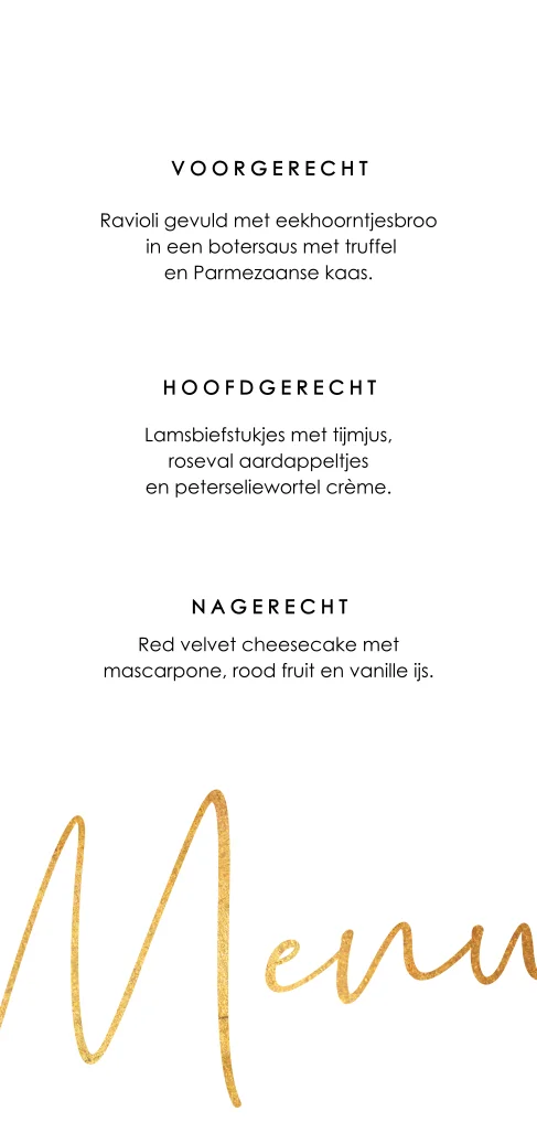 Clean menukaart waarmee jullie het menu van jullie diner, lunch, high tea, sweet table of drankenkaart kunnen vermelden.