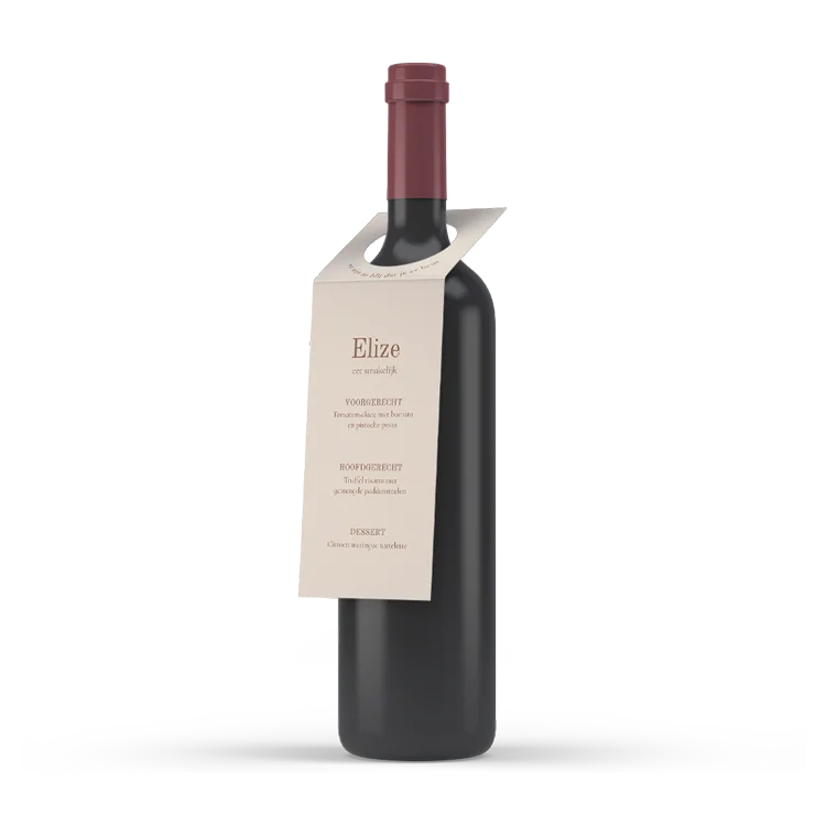 Wat een originele manier om het menu te presenteren op jullie bruiloft! Je hangt deze wijnhanger gemakkelijk aan de hals van de fles. De naam van jullie gast maakt de menukaart extra persoonlijk.
