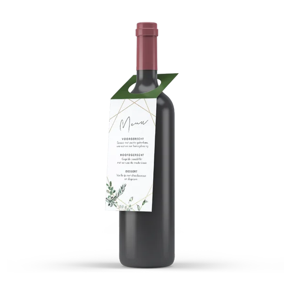 Wat een originele manier om jouw menu te presenteren op jouw bruiloft! Je hangt deze wijnhanger gemakkelijk aan de hals van de fles.