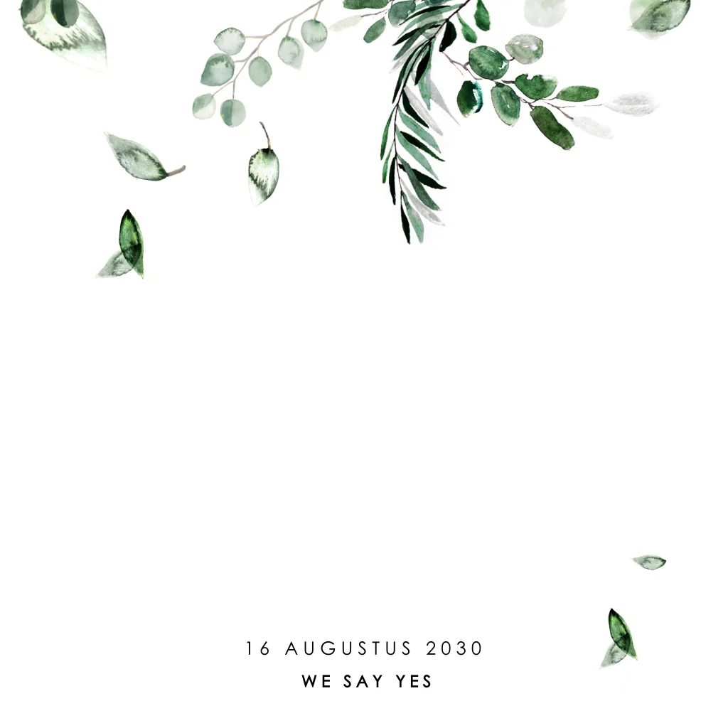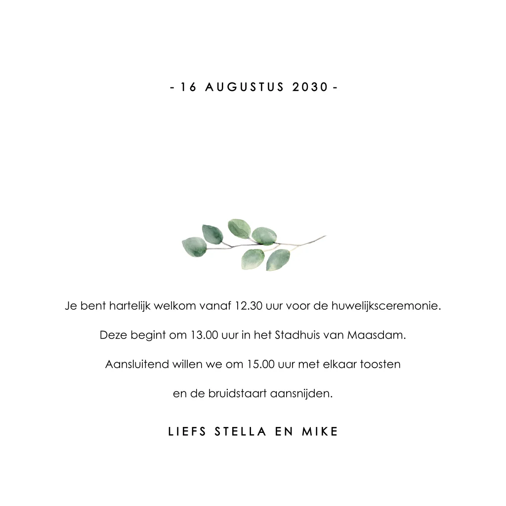 Trendy trouwkaart in de mooie botanical stijl. Mooie groene eucalyptus takjes en sierlijke letter. De gouden elementen op de kaart zoals jullie namen en hartjes, worden gedrukt in echt goudfolie! Dat maakt de trouwkaart extra bijzonder. Mooi met een olijfgroene envelop en gouden hartjes sluitzegel.