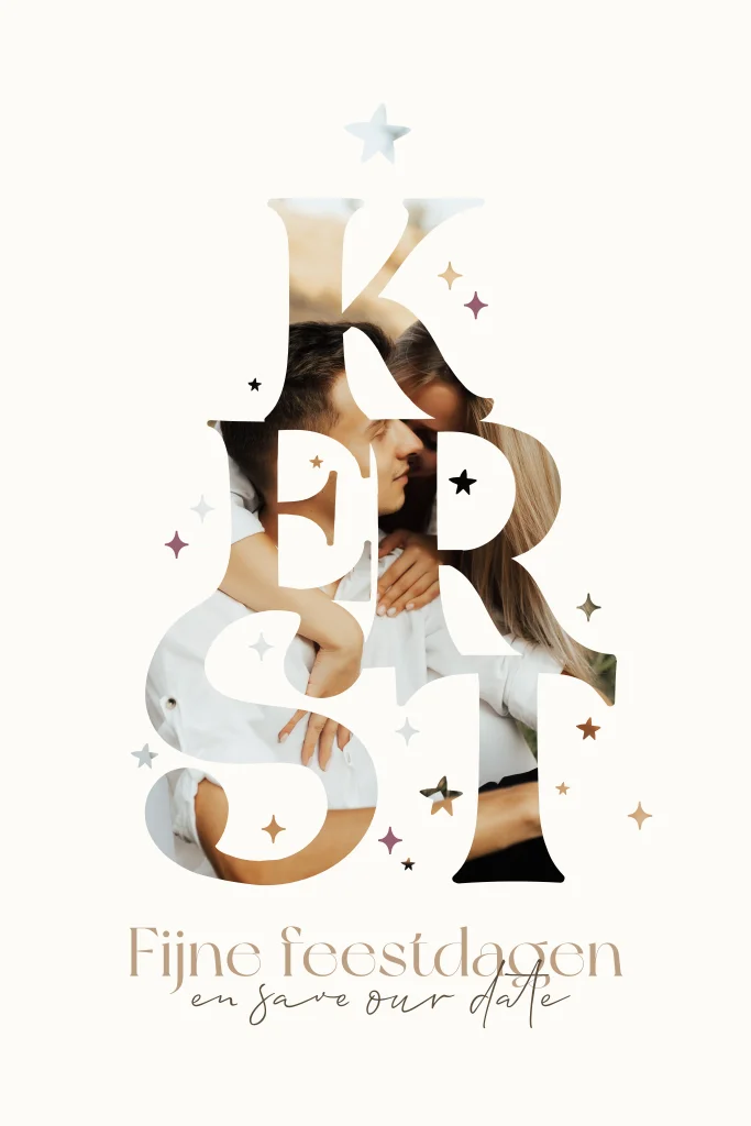 Verras je bruiloftsgasten met lieve kerstwensen én de datum voor jullie huwelijk! Deze kerst Save the date kaart heeft een foto in de vorm van het woord kerst, met daar omheen allemaal vrolijke sterretjes. Bewerk het ontwerp in de online editor.