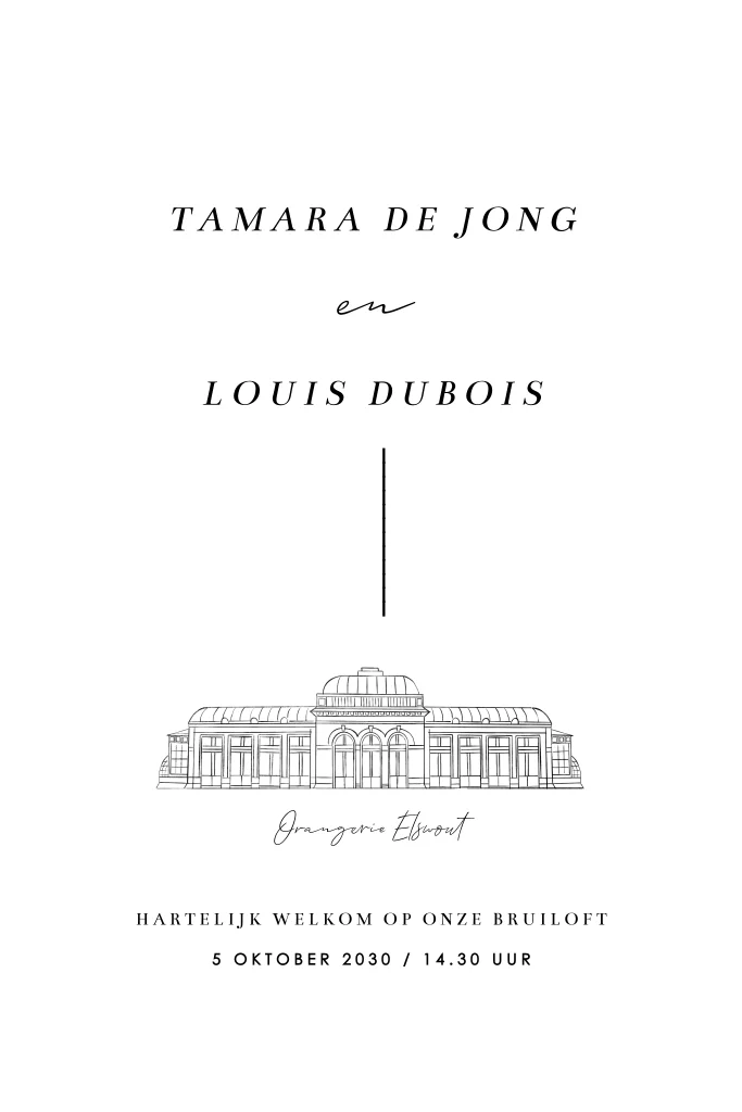 Stijlvolle trouwkaart met getekende trouwlocatie Orangerie Elswout.