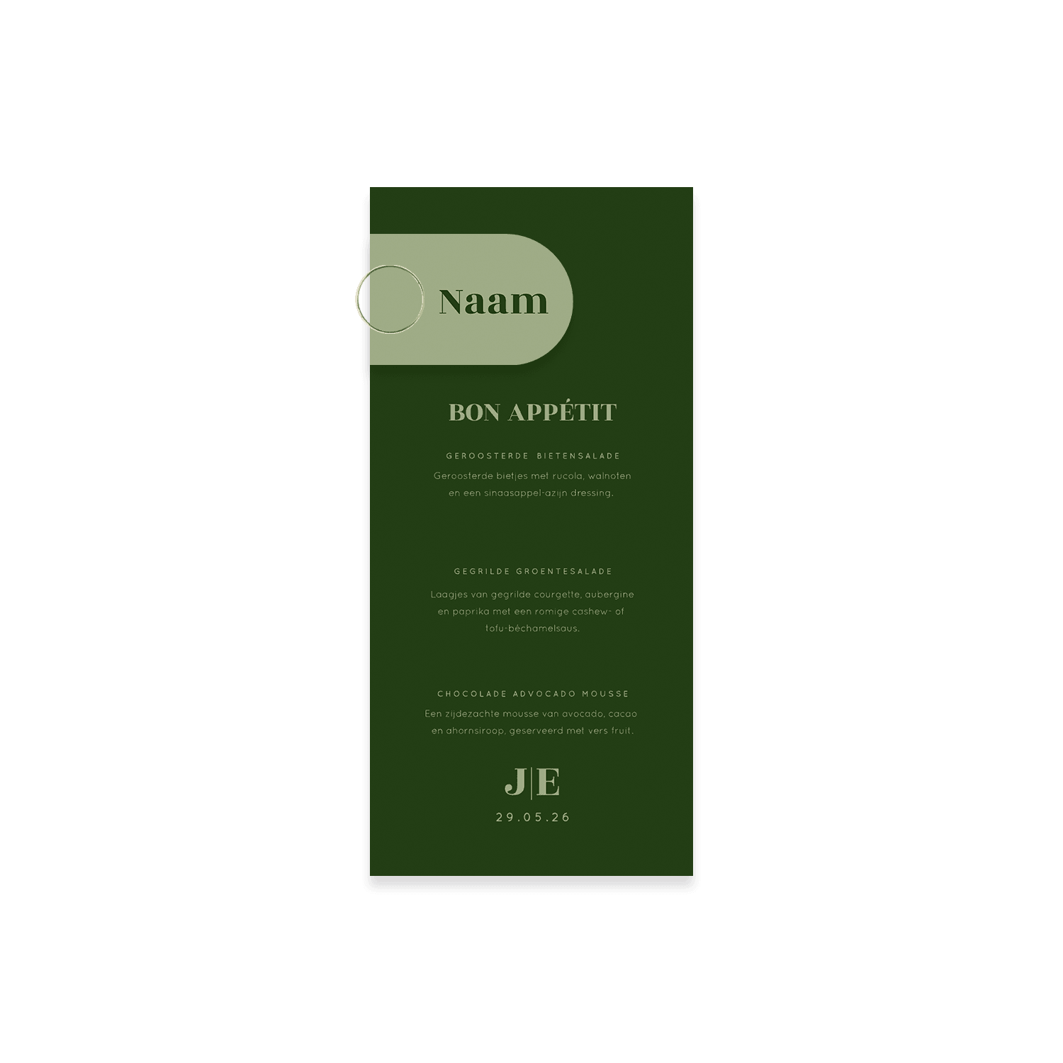 Trendy menukaart in donkergroen. Bij deze menukaart hoort dit naamkaartje . Deze moet los van de menukaart besteld worden. Let op: dit vel gaat per 18 namen. Vergeet ook niet het bevestigingsmateriaal te bestellen.