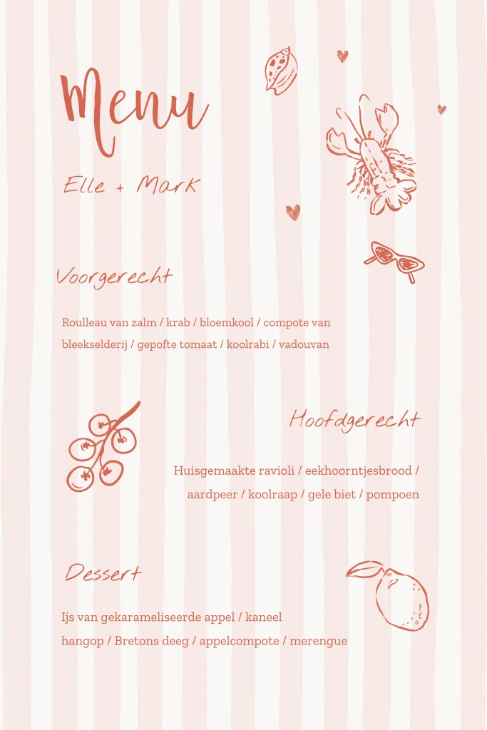 Menukaart bruiloft in Italiaanse stijl met strepen en illustraties