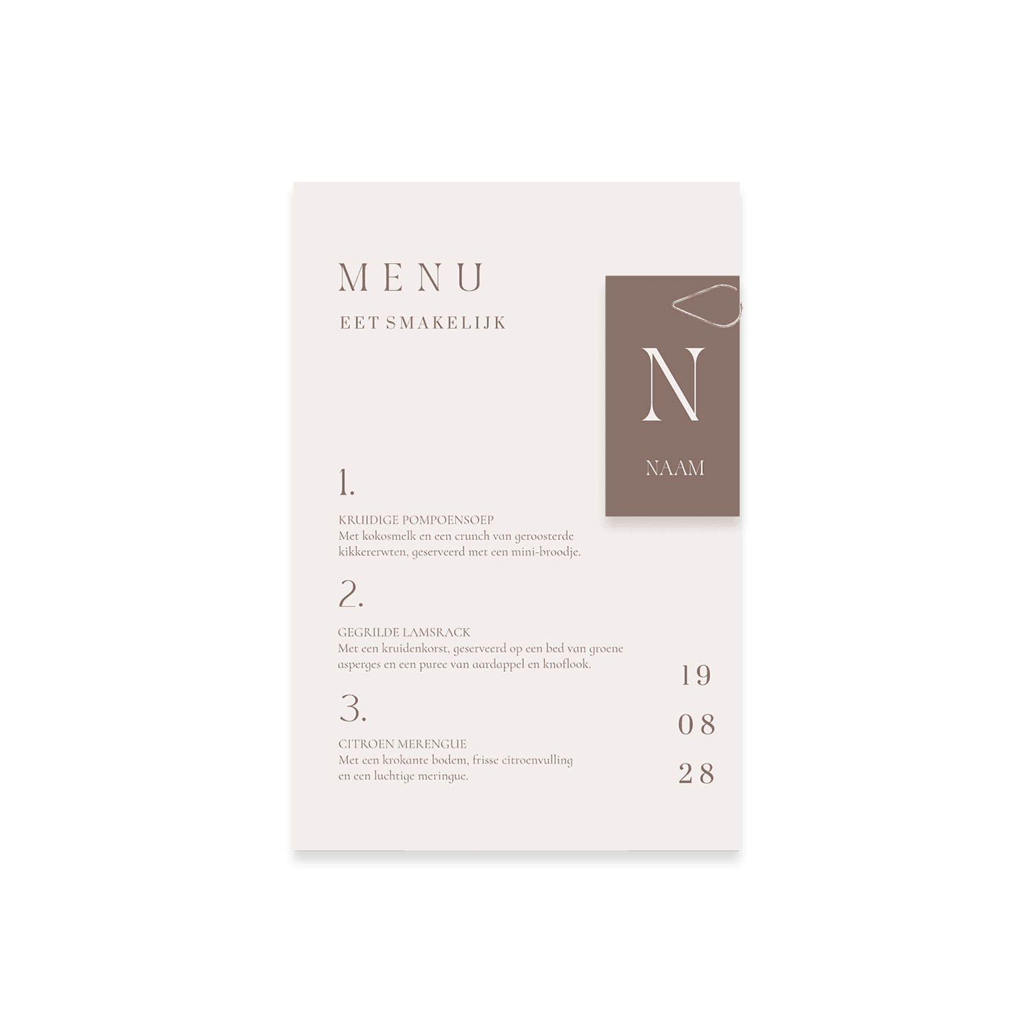 Menukaart in neutrale kleuren. Bij deze menukaart hoort dit naamkaartje . Deze moet los van de menukaart besteld worden. Let op: dit vel gaat per 12 namen. Vergeet ook niet het bevestigingsmateriaal te bestellen.