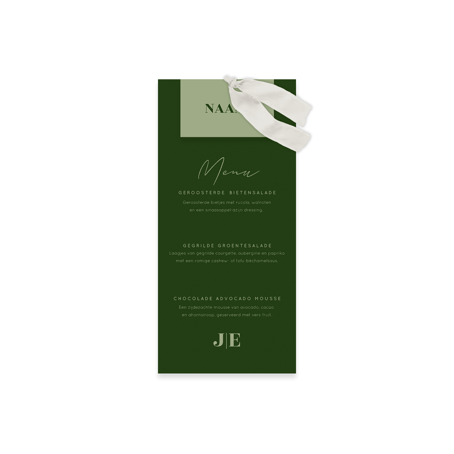 Groene menukaart met moderne typografie en initialen van het bruidspaar. Bij deze menukaart hoort dit naamkaartje . Deze moet los van de menukaart besteld worden. Let op: dit vel gaat per 10 namen. Vergeet ook niet het bevestigingsmateriaal te bestellen.