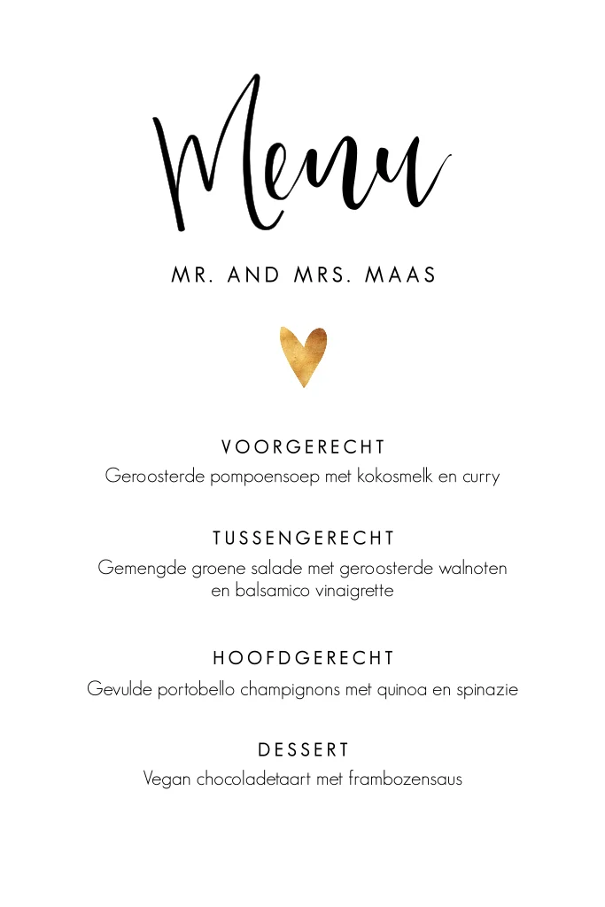 Stijlvolle menukaart met gehandletterde tekst en goudlook hart.