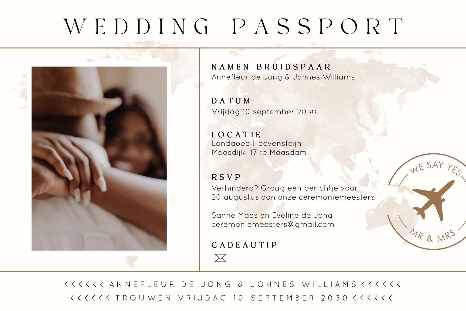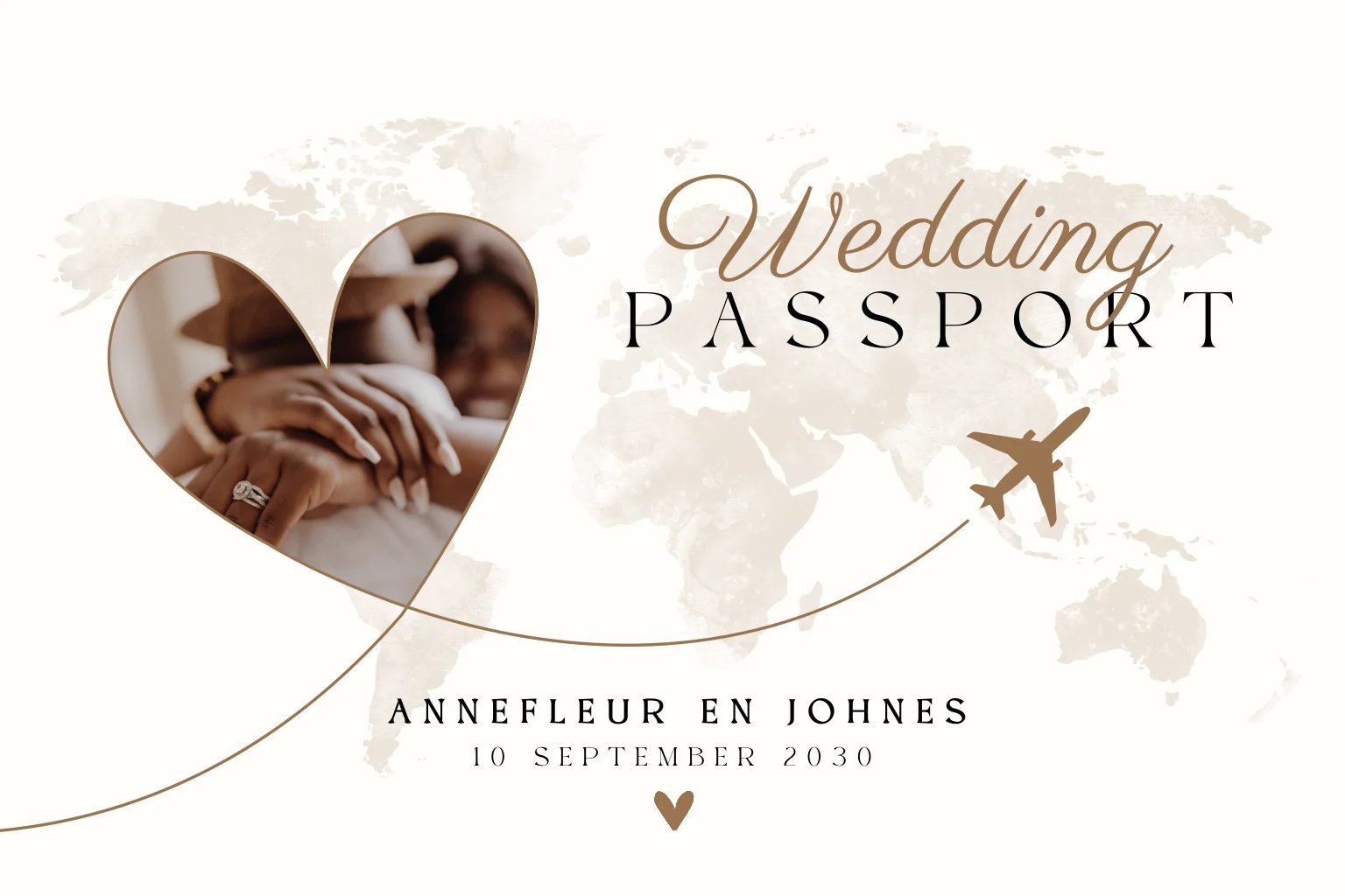 Op zoek naar een romantische en stijlvolle wedding passport uitnodiging voor jullie bruiloft? Deze trouwkaart heeft een zachte, lichte uitstraling met een subtiele wereldkaart op de achtergrond. Het hartvormige fotokader geeft ruimte voor een persoonlijke foto en zorgt voor een liefdevol detail. De fijne lijnen en warme tinten maken het ontwerp tijdloos en elegant. Bewerk de kaart eenvoudig in de editor en voeg jullie eigen namen, foto en trouwdatum toe.