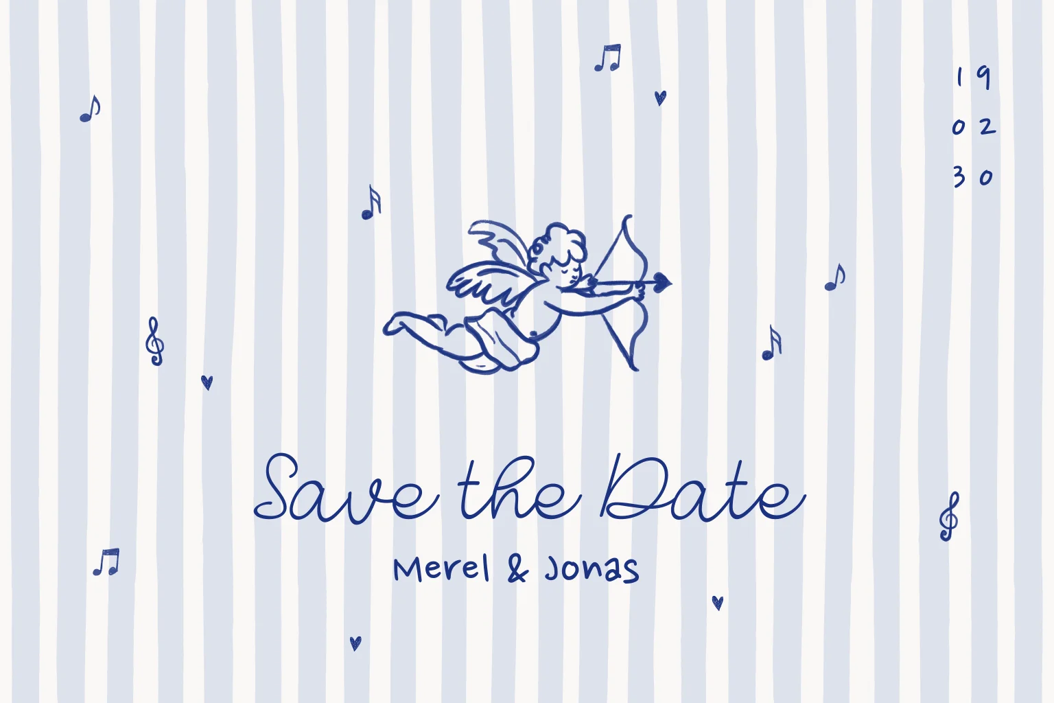 Een romantisch Save The Date kaartje in blauw met streeppatroon en cupido, perfect voor jullie trouwdag. Pas het ontwerp aan in onze online editor.