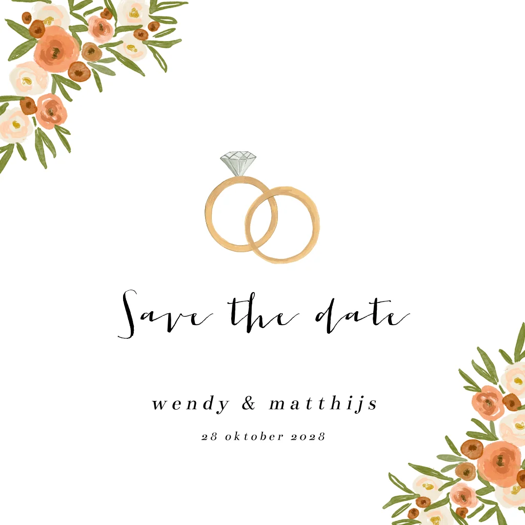 Nodig jullie gasten uit met deze prachtige Save the date kaart in herfstkleuren. De geïllustreerde ringen en bloemen maken deze kaart extra bijzonder!