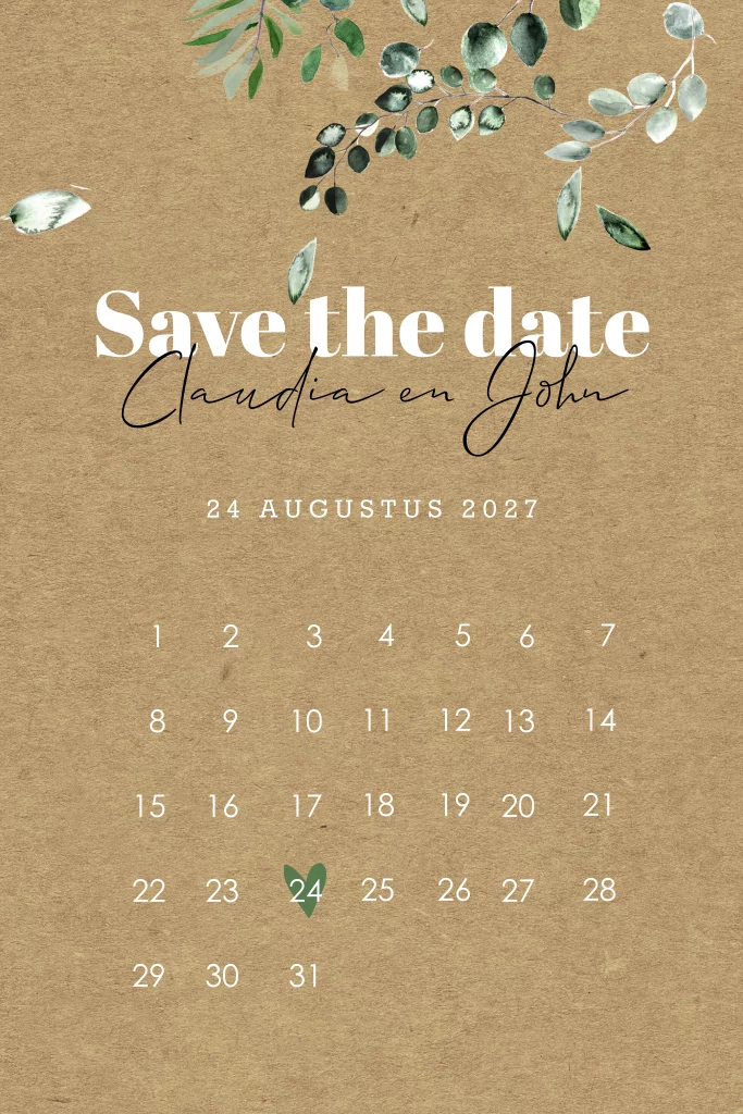 Jullie gaan trouwen, yes! Nodig jullie gasten uit voor jullie bruiloft met deze prachtige botanische Save the Date kaart met kalender. Je kunt het ontwerp gemakkelijk aanpassen met de online editor.