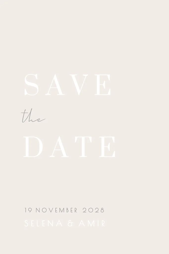 Een stijlvolle Save the Date kaart in beige met elegante grijze typografie. Iets aanpassen? Dat kan gemakkelijk met de online editor!