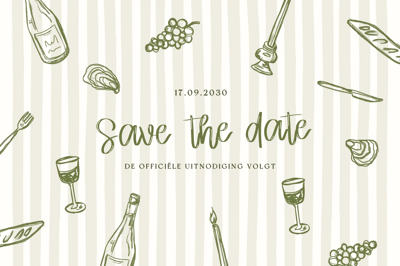 Hoe leuk is deze save the date kaart voor jullie bruiloft? De strepen en de illustraties in groen geven een vrolijke uitstraling. Pas tekst en kleuren eenvoudig aan in de online editor.