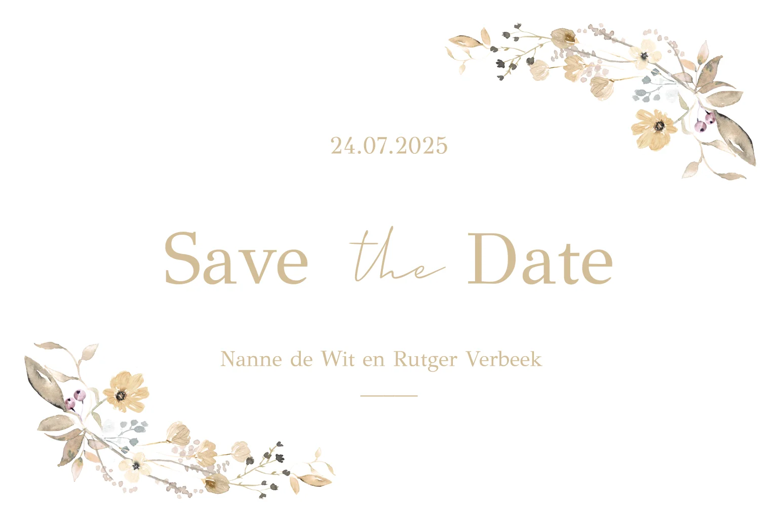 Een stijlvolle save the date kaart met bloemen in rustige tinten in twee hoeken. De ronde hoeken maken het helemaal af.