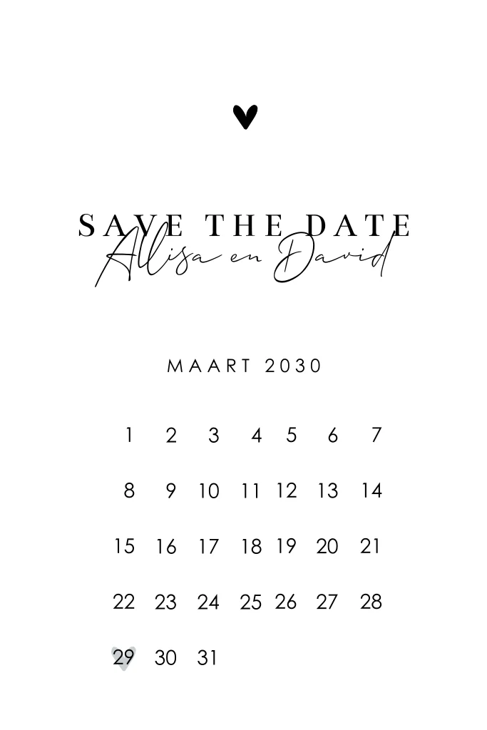 Deze save the date kaart heeft een kalender op de voorzijde, waardoor alle aandacht gaat naar de datum van jullie grote dag.